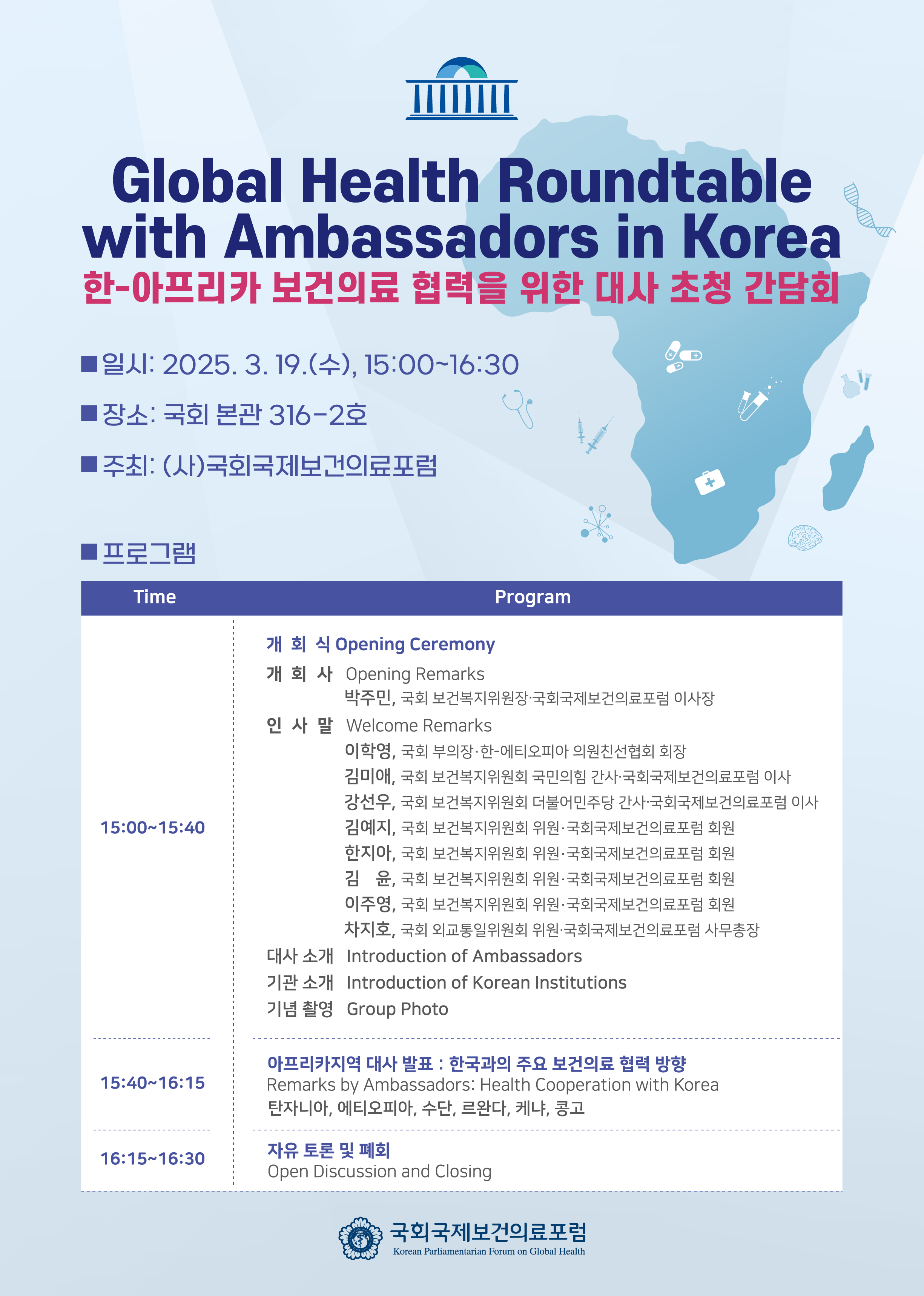 (사)국회국제보건의료포럼은 국회 소관 사단법인으로 2015년 국회 보건복지위원회 의원을 중심으로 보건의료분야 입법 활동과 정책‧제도 및 예산에 관한 국제 교류와 협력을 도모하고, 국가별 보건의료분야 문제의 공동 해결을 모색하기 위해 창설되었습니다.